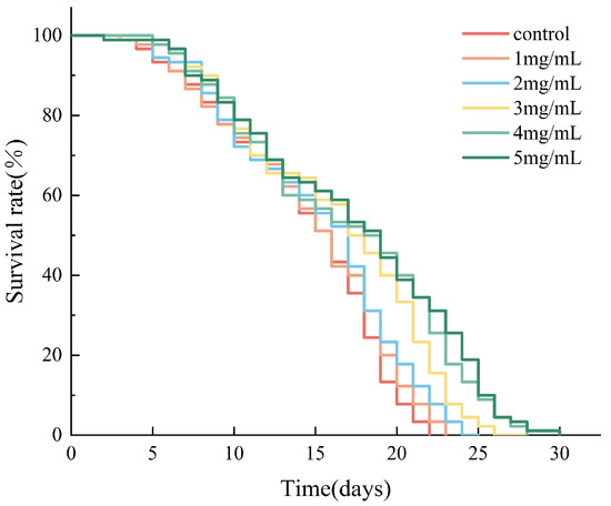 Survival curves of C. elegans treated with AAPs (0, 1, 2, 3, 4, and 5 mg/mL).