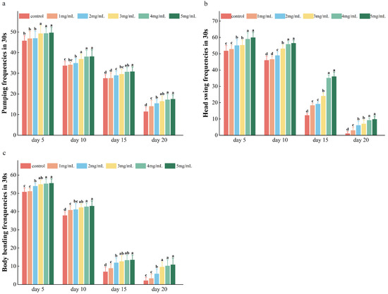 (a–c) Effects of AAPs on the swallowing frequency, head-swing frequency, and body-bending frequency of C. elegans. The data are expressed as the means ± standard deviations; the different letters on the bars (a, b and c) indicate statistically significant differences in all of the treatment groups (p < 0.05).