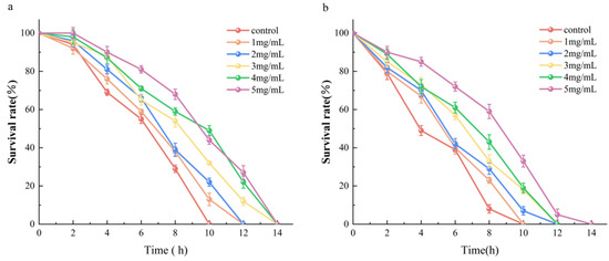 Survival curves of C. elegans treated with AAPs (0, 1, 2, 3, 4, and 5 mg/mL) after heat stress (37 °C) (a) and juglone stimulus (b).