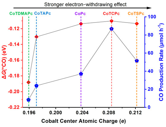 Structure-activity relationship. Plots of ΔG(* CO) (red diamond) and CO production rate (blue pentagon) of five Co(II) catalysts versus their Hirshfeld Co atomic charges, showing the correlations between ΔG(* CO) and catalytic activity as well as the volcano-like trend in electronic effects.