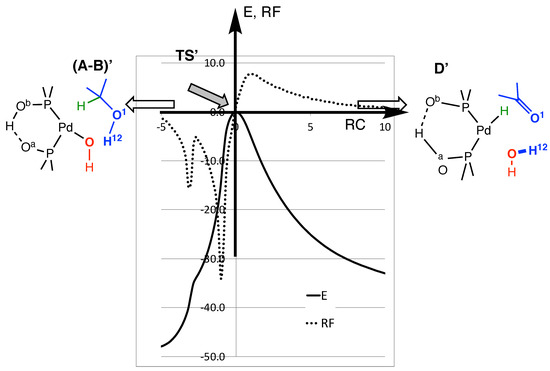 The energy (E) and reaction force (RF) plots of the direct mechanism are displayed in Figure 3. The reaction processes from the left (A-B)’, alcohol reactive) to the right (D’, ketone formation), with a focus on the transition state TS’ region. TS’ is perfectly located at RC = 0, but both (A-B)’ and D’ would be outside the figure, along the horizontal axis. The plots are along the IRC path. They follow the reaction coordinate (RC). The IRC path converges very slowly to D’, and because the plots are close to the transition state, it is not possible to reach the D’ geometry. The same applies to (A-B)’, and the global exothermicity of the reaction cannot be read from the energy curve. This would require a further reorganization of the reactive on the left, and of the product on the right. The energy does not include the ZPC; thus, the estimated barrier height appears higher than the value reported in Table 2.