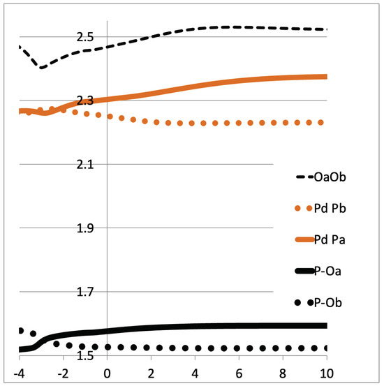 The dotted curve shows the variation in the reaction force (RF) (Equation (1)) along RC (in kJ/mol/RCunit). It is set that RF = 0 at the geometry of TS’, and as usual [49,50,51]. It is negative on the left of the transition state, and positive on the right. RF shows an unusual shape, with two extrema before the transition state, instead of one. Each extremum corresponds to a chemical event during the reaction [52,53]. To better illustrate those two events, we plotted the distance variation during the IRC path (Figure 4). The RC axis is the same as that of Figure 3.