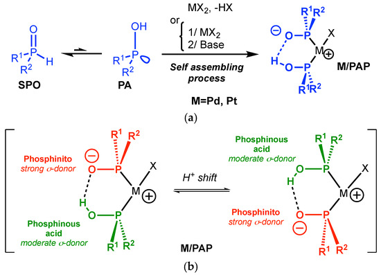 However, the introduction of purely covalent spacing groups between the two donating sites requires time-consuming, tedious and stepwise synthesis. Another approach relies on the harnessing of noncovalent interactions between two monodentate organophosphorus ligands [7,8,9] to mimic the structure of a bidentate ligand through a self-assembling process as illustrated by Reek et al. in 2009 (Figure 1(2)) [10,11]. The chemistry of the phosphinito–phosphinous acid (PAP) ligand is based on this paradigm. The PAP ligand is obtained by coordination of two secondary phosphine oxides (SPOs, Scheme 1) in their phosphinous acid form (PA, Scheme 1) [12] and their self-assembling by hydrogen bonding is triggered by deprotonation (Scheme 1) [13,14,15,16,17,18,19]. M/PAP complexes have been widely used as catalysts in a broad range of reactions, as overviewed by Ackermann [20], Achard [21], and more recently by Verdaguer [22] and van Leeuwen [23]. The PAP ligand allows us to achieve high performances in CC bond formation [12,24,25].
