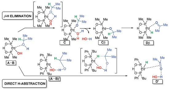 The standard β-H elimination (Scheme 4, top) is the generally accepted mechanism for the alcohol oxidation reaction [37,38]. Starting from a complex (A-B), it involves an intramolecular Pd-assisted deprotonation, that leads to C, followed by a water elimination to Cβ and a β-hydride elimination that leads to Dβ. It has been confirmed by a significant number of theoretical studies [39,40,41,42,43].