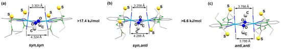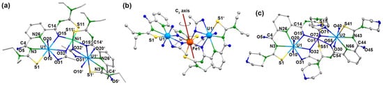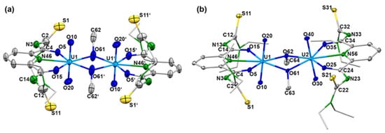 While details of the structure of the syn,syn-[{UO2(LEt2)(µ-OMe)}2]2− anion have already been reported [41], ellipsoid representations of the anti,anti and syn,anti isomers are shown in Figure 2. The different orientations of the methanolato ligands and the thiourea sulfur atoms relative to the central coordination plane are clearly seen. The anti,anti orientation of these units in the (HNEt3)2[{UO2(LEt2)(µ-OMe)}2] isomer shown in Figure 2a is enforced by the inversion center of the molecule being located in the central U2O2 unit. Selected bond lengths and angles are given in Table 1 and are compared with the values of the syn,syn isomer. A closer inspection of the values in this table reveals only a marginal difference between the three isomers. This is not surprising with regard to their close structural relationship and the fact that the isomerism found is characterized by only minor energy differences between the species. Thus, the main structural features can be shortly discussed for the three complexes together.