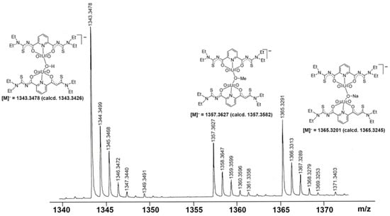Further evidence for a dynamic equilibrium in solutions of the dimeric compounds is given by mass spectrometry. Irrespective of the isomers or counter ions used, ESI(–) mass spectra of the of [{UO2(LEt2)(µ-OMe)}2]2− salts show fragmentation patterns containing fragments, which confirm the presence of a variety of monomeric and dimeric uranium-containing species. One or two bridging units are formed by the used solvents (e.g., methanol or methanolate), but also species with bridging hydroxido units have been detected. Figure 3 depicts a fraction of the [M]− peaks of such a spectrum, in which peaks belonging to species such as [{UO2(LEt2)}2(µ-OH)]−, [{UO2(LEt2)}2(µ-OMe)]−, and [{UO2(LEt2)}2(µ-ONa)]− are clearly resolved with the correct isotopic patterns.