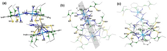 The two lead ions are coordinated monodentate with the sulfur atoms of the same {LEt2}2− ligand of the dimeric [{UO2(LEt2)(µ-OMe)}2]2− subunit, while with the monomeric subunit [{UO2(LEt2)2]2− an S,O chelate formation is established, sharing the oxygen atoms with uranium. In contrast to the seven-coordinate uranium ions of the syn,syn-[{UO2(LEt2)(µ-OMe)}2]2− subunit, in the monomeric subunit [UO2(LEt2)2]2− a hexagonal-bipyramidal geometry around the uranium atom is found. The formation of S,O chelates of Pb2+ ions with aroylthioureas aligns with previous findings [52,53].