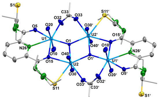 The compound crystallizes in the centrosymmetric, triclinic space group P with one- half of the molecule in the asymmetric unit. The [{(UO2)2(LEt2)(µ2-OAc)(µ3-O)}2]2− anion consists of four uranyl cations and two {LEt2}2− ligands, which are coordinated in a tetradentate O,N,O,S fashion. Each ligand coordinates two uranyl ions and the resulting sub-units are bridged by two µ3-oxido and two bidentate-coordinated acetato ligands. This results in a diamond-like arrangement of the four uranium atoms. The inversion center is located in the center of the rhombus formed by the atoms U2, U2′, O1 and O1′ (Figure 7). Each uranium atom establishes a pentagonal-bipyramidal geometry. The uranium atoms U1 and U1′ are coordinated by two oxygen atoms and the pyridine nitrogen atoms of {LEt2}2−, one oxygen atom of the acetato ligand and the µ3-oxido ligand. The uranium atoms U2 and U2′ are coordinated by the S,O chelate ring of the {LEt2}2− ligands, one oxygen atom of the acetato ligand and two µ3-oxido ligands. It should be mentioned that the coordinated sulfur atom S11 is subject of a partial hydrolysis and the structure is best refined with a S/O disorder of 90/10. The hydrolysis of thiourea functionalities in {LR}2− ligands is not without precedence and has been found for other uranium complexes, where a complete S/O exchange obviously facilitates the coordination of such ligands to the “hard” {UO2}2+ ions [78]. Since in the present example such an exchange is observed to a minor degree, it should not be subject of an extended discussion. Nevertheless, the formation of the tetranuclear uranium complex nicely illustrates the structural flexibility of the products, which can be isolated from {UO2}2+/H2LR/metal acetate reaction mixtures and the strong dependence of the preferred products on the pH value in such solutions. Further support for this assumption is given by slight variations in the reaction conditions in such mixtures.