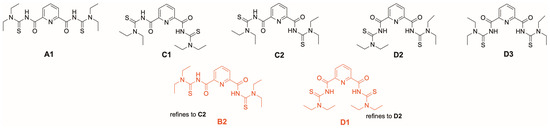 This information is somewhat misleading with regard to the coordination chemistry with deprotonated {LEt2}2− ligands. Four out of the five conformers shown in Figure 10 can establish one (conformers B2 and C2) or two (conformers D1 and D3) hydrogen bonds between the amide units and the central pyridine nitrogen atom. As stated for the conformers of the uranium complexes above, the relatively small energetic differences between conformers could easily be overcome by solvation, packing effects or, as in this case, hydrogen-bonding, all of which may play a key role in the evaluation of their relative thermodynamic stability. Indeed, such hydrogen bonding has been found in the crystal structure of the compound [44]. Thus, it might be more instructive to have a look at the situation of the related isophthaloylbis(N,N-diethylthiourea), which has a central phenyl ring instead of pyridine and, consequently, for which such NH…N interactions cannot be formed. Analog DFT calculations for the related conformers effectively confirm the analogous structure to A1 as the most stable isomer [41]. A similar sequence should also be expected for the deprotonated ligand {LEt2}2− and explains that most of the hitherto structurally studied complexes with this ligand and “hard” metal ions establish a neutral O,N,O coordination. Metal complexes with the conformations B2, C2 and D3 have also been reported [42,43]. Examples for the pentadentate coordination with conformer D3 are known for rhenium and technetium complexes [79,80]. The same coordination mode has recently also been found for monomeric uranyl complexes [UO2(LEt2)(solv)] (solv = MeOH, DMF) [41].