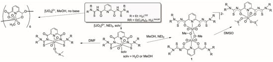 The available structural information about uranium(VI) complexes with sulfur-containing ligands is relatively restricted, and the Cambridge Structural Database contains less than 70 uranyl complexes with uranium–sulfur bonds [27], while some more is known about corresponding compounds with uranium in lower oxidation states [28,29,30]. The ligands involved in the related uranyl studies mainly belong to chalcogenocarbamates, thiosemicarbazones and related compounds, bis(thiophosphinoyl)methanediides or imidodiphosphinochalcogenides [28,29,30,31,32,33,34,35,36,37,38,39,40]. In a recent paper, uranyl complexes with bifunctional aroylbis(dialkylthioureas), H2LR (Scheme 1), have been studied [41]. Such ligands possess “hard” (carbonyl units), “medium soft” (pyridine rings), and “soft” (thiourea moieties) donor atoms and allow a flexible coordination behavior depending on the respective metal ions [42,43,44,45,46,47]. Only weak uranium–sulfur bonds are established with {UO2}2+ ions, which are readily cleaved when alternative bonding modes. For example, coordination to (hard) donor solvents becomes available (Scheme 1).