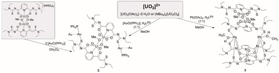 For potential mixed-metal complexes, the combination of “hard” uranyl ions with “soft” metal ions should be interesting. Typical representatives of the latter are Au+ or Pb2+ ions. From reactions of these ions with H2LR ligands, hitherto no defined products could be isolated and structurally characterized, but there are several reports with related aroylthioureas including the parent, potentially O,S-bidentate benzoylthiourea ligand system, where exclusively S-coordination has been observed with gold ions [48,49,50,51], while chelate formation has been observed for Pb2+ ions [51,52,53]. Interesting, reactions patterns were observed when Au(I) complexes were exposed to H2LR ligands together with other metal ions such as lanthanide or other M3+ ions, alkaline earth M2+ ions or transition metal M2+ ions. Large metallacoronands consisting of {(AuLR)n}n− ring systems (n = 2–4) are formed, which accommodate the mentioned M2+ or M3+ metal ions in their center [46,54,55,56]. Recently, such compounds even found consideration for nuclear medical procedures using the radioactive isotope 198Au [57]. The reactions of common gold or lead starting materials with H2LEt2 conducted in the presence of uranyl compounds followed the previously observed reaction patterns and gave the mixed-metal complexes summarized in Scheme 2.