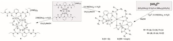 Summarizing the information, it must be concluded that solutions containing uranyl ions and H2LR ligands can contain a variety of monomeric and dimeric species. The formation and potential reformation of the species depend on the solvents and pH of such solutions and the presence of potential counter ions for the precipitation of ionic complex species. Thus, the conformation of the ligands in solution as well as the nature of the bridging ligands are subjects of various equilibria, which should not at least also have consequences for reaction with additional metal ions as can be seen from Section 2.2 and Section 2.3.