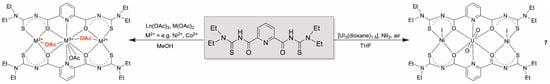 Most of the hitherto studied bimetallic complexes with {LR}2− ligands and M2+ and M3+ metal ions have been prepared from metal acetates and a screening of their structures confirms that almost all of them contain acetato co-ligands. With the exceptions of the [MM’(LR)3]0,+ complexes [42,43,44,76,81] and a few examples, in which the coordination spheres of the transition metal ions are completed by solvent molecules [42], the acetato ligands act as bridges between the different metal ions. A typical example is shown in Scheme 4 with the structure established with lanthanide and M2+ ions [45].