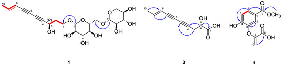 Key COSY (red line) and HMBC (blue arrow) correlations of compounds 1, 3, and 4.