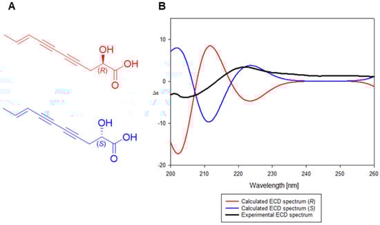 Compound 3 was isolated as a yellow oil, and its molecular formula was determined by HR-ESI-MS with a molecular ion peak at m/z 179.0708 [M + H]+ (calcd for C10H11O3, 179.0704; Figure S8). The UV spectrum exhibited an absorption band at 254, 265, and 282 nm. The 1H NMR spectrum of 3 exhibited a methyl signal at δH 1.78 (3H, H-10), a methylene signal at δH 2.52 (2H, H-3), two olefinic signals at δH 5.55 (1H, H-8) and δH 6.29 (1H, H-9), and an oxygenated methine signal at δH 4.73 (1H, H-2) (Figure S9 and Table 1). The 13C NMR spectrum showed ten signals including quaternary carbons at δC 69.6, 72.7, 78.2, and 83.6 (Figure S10 and Table 1). The planar structure of 3 was further determined using an HMBC experiment by the following correlations: H-2 to C-1/4, H-3 to C-5, H-9 to C-7, and H-10 to C-8 (Figure 2 and Figure S11). To determine the absolute configuration of 3, we performed an ECD experiment and observed the positive cotton effect at 225 nm (Figure 3). Therefore, the structure of 3 was elucidated as (2S,8E)-2-hydroxydeca-8-en-4,6-diynoic acid.
