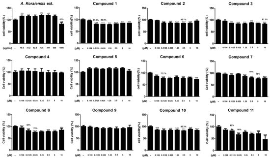 Effects of A. koraiensis extract and isolated compounds 1–11 on cell viability in HaCaT keratinocytes. HaCaT keratinocytes were incubated with various concentrations of A. koraiensis extract or isolated compounds 1–11 for 24 h, and cell viability was measured by MTT assay. * p < 0.05, ** p < 0.01, and *** p < 0.001 vs. A. koraiensis non-treated group.