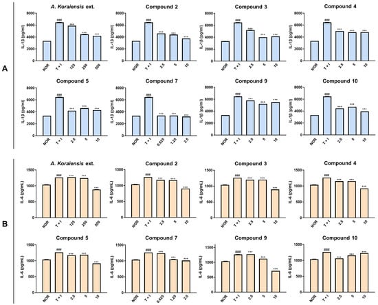 Meanwhile, IL-6 expression was amplified in the T+I group (p < 0.001), similar to the increase pattern observed with IL-1β (Figure 5B). However, A. koraiensis extract displayed a significant inhibitory effect only at a concentration of 500 μg/mL. The pretreatment groups of selected compounds dose-dependently diminished IL-6 levels on TNF-α/IFN-γ-induced HaCaT cells, except for compound 9, which showed a slight increasing trend at higher concentrations.