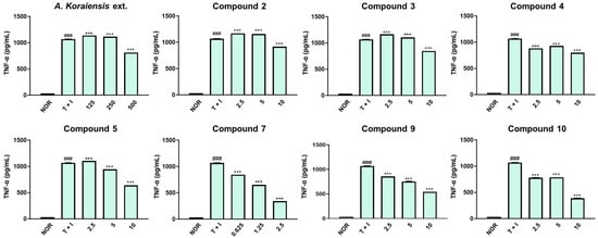 Lastly, we assessed the TNF-α secretion induced by TNF-α/IFN-γ exposure. TNF-α is reproduced in stimulated keratinocytes, contributing to the progression of atopic dermatitis into chronic inflammation. TNF-α plays a crucial role in the early stages of the inflammatory response and induces the expression of successive inflammatory cytokines such as IL-1β and IL-6 [27,28]. Figure 6 presents that TNF-α release into the supernatant increased in TNF-α/IFN-γ (p < 0.001). In line with the IL-6 results, the A. koraiensis extract inhibited TNF-α production at a concentration of 500 μg/mL and exhibited a dose-dependent inhibition of TNF-α production (p < 0.001). The pretreatment groups of isolated compounds demonstrated inhibitory properties at 10 μM (p < 0.001), indicating that treatment with individual compounds effectively suppressed TNF-α levels compared to treatment with the A. koraiensis extract. Specifically, saponins (7, 9, and 10) from A. koraiensis exhibited a dose-dependent inhibitory effect in comparison to other compounds. Astersaponin I (7) shows the strongest inhibitory effect at a concentration of 2.5 μM among the compounds.