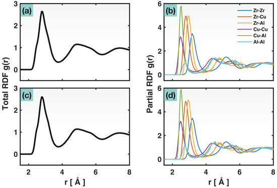 After completion of the simulated tensile test, the visualization of atoms and atomic bonds and certain data analyses (e.g., overall and partial radial distribution functions (RDFs), selection of atoms with significant atomic shear strain, and identification of their elemental types) were conducted using the OVITO (Open VIsualization TOol, version 2.9.0) software [37]. The cutoff distance values for defining various atomic bonds were taken from the valley between the first and the second peaks on the partial RDF curves for the target atomic pairs (e.g., Cu-Cu, Zr-Cu). This is discussed in more detail in Section 2.