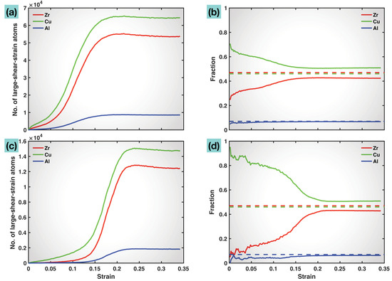 With the large-shear-strained atoms selected out, their elemental identities can be analyzed. Figure 3a,b plot the numbers (counts) of atoms and the fractions of the different elements among the large-shear-strained group (>0.3 atomic shear strain), as functions of the overall tensile strain. In terms of numbers, all the three elements have more and more atoms participating in the large-shear-strained group as the tensile strain increases, while the number of Cu atoms in the group is always the greatest, followed by Zr and then Al. In terms of fraction, the Cu fraction in the group decreases whereas the Zr and Al fractions both increase with increasing tensile strain. However, the Cu fraction in the group always stays the highest and clearly above the Cu fraction (46%) in the overall material composition. This shows that Cu makes the biggest contribution to the plastic deformation of the multicomponent MG, especially in the pre-yielding stage (in the form of STZs). In contrast, the Zr fraction in the large-shear-strained group is significantly below the Zr fraction (47%) in the material composition, which is also particularly noticeable prior to yielding. The Al fraction in the group is slightly below the Al fraction (7%) in the material composition in the early stage, and later approaches very close to 7%.