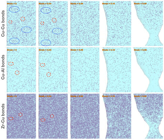 Snapshots (enlarged and cropped for clarity) from MD movies (Supplementary Materials) showing the behaviors of Cu-Cu (top row), Cu-Al (middle row), and Zr-Cu (bottom row) bonds across five levels of tensile strain, 0, 0.04, 0.08, 0.18, and 0.28. The red dashed ellipses outline examples of corresponding bonds. The blue dotted ellipses outline examples of reconstructed bonds.