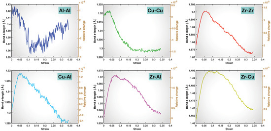 (6). The intermediate bonds, Zr-Zr and Cu-Al, and the strong bonds, Zr-Al and Zr-Cu, are reconstructed at times more coinciding with the material’s yielding, implying their significant roles in deciding the material’s yielding, yield strength, and elastic deformability.