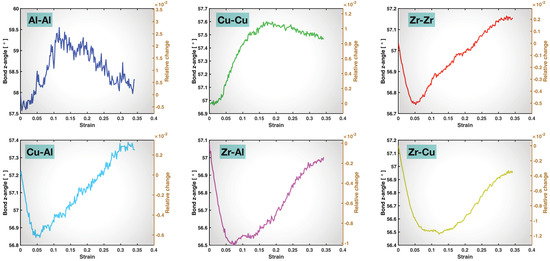 Since the tensile load is along the z-direction, the bonds are mainly stretched in the z-direction, while being rotated towards (more parallel to) the z-axis, prior to the material’s yielding, or more appropriately, prior to the reconstruction of each bond type (which could be termed as “individual bond yielding”). We can expect to see the trend of bond stretching (and rotation) and its turning point more clearly by projecting the bond length (and bond angle) onto the z-axis. As shown in Figure 6, the averaged bond z-length exhibits a brief and relatively small increment for Al-Al and Cu-Cu bonds, up to ~1% and 0.3% relative change with respect to the start, respectively, and then starts to drop at ~0.04 tensile strain, which, again, is clearly earlier than the apparent yielding of the material. In contrast, the intermediate bonds, Zr-Zr and Cu-Al, sustain stretching up to ~1.3% relative change in the averaged bond z-length, and the strong bonds, Zr-Al and Zr-Cu, up to ~2.1% and 2.2% relative change, respectively. And, for all the latter four bond types, the bond z-length increment continues until very close to the material’s yielding, again indicating the correlation between the reconstruction of these intermediate and strong bonds and the overall material yielding. The magnitudes of the relative changes in the averaged bond z-lengths of all the bond types (including the weak bonds) during the bond stretching stage here are notably higher than those in the non-projected overall bond lengths in Figure 5, as expected based on the loading direction.