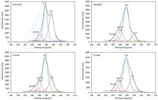Additional information regarding the chemical changes on the surface of the cotton fabric after plasma treatment and the chemical bonding of the elements on the surface was obtained from high-resolution XPS spectra (Figure 1). The peaks in Figure 1 consist of several subpeaks that belong to the specific bindings of C atoms on the surface: C–C bond, C–O bond, O–C–O or C=O bond, and O=C–O bond. The peaks were deconvoluted, and the approximate relative concentrations of these bonds are listed in Table 2.