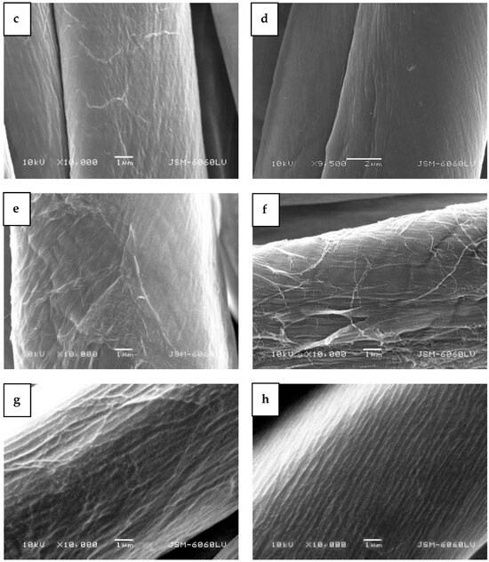 SEM images of bleached, mercerized cotton fabric samples: (a,b) untreated, (c,d) treated with plasma afterglow, (e,f) treated with plasma in E-mode, (g,h) treated with plasma in H-mode.