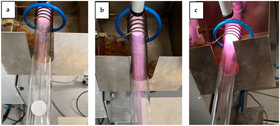 The cotton fabric used as reinforcement for the cellulose biocomposites was treated in a low-pressure radiofrequency inductively coupled plasma system (Figure 7). For all treatments, oxygen gas was used at a pressure of 38.2 Pa. The cotton fabric was cut into circular samples of 2.5 cm diameter. The power and duration of the plasma treatment were varied, as shown in Table 5.