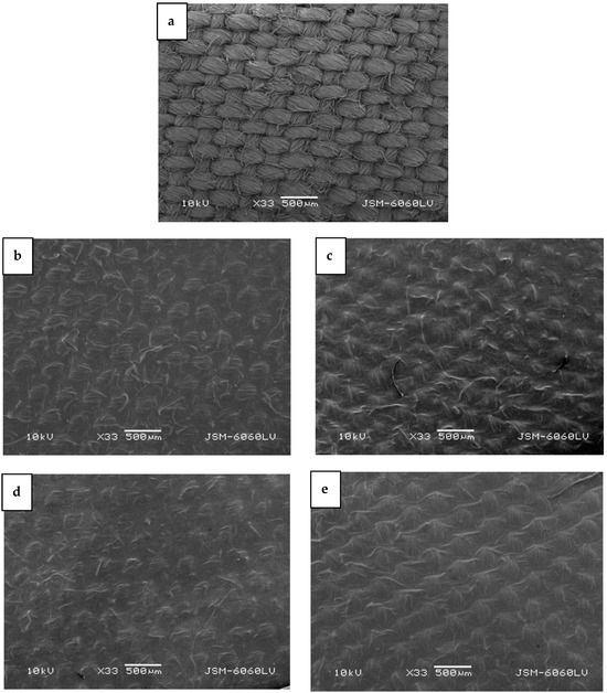 In cases where cotton fabric was incorporated into the bacterial cellulose medium to form a biocomposite (Figure 4b–e), the typical surface characteristic appearance of plain woven fabric (Figure 4a) was reduced. However, the biocomposite sample in which cotton fabric treated with plasma in H-mode was used (Figure 4e) was visually different from the other biocomposites (Figure 4b–d), as the BC membrane was formed more uniformly on the fabric, giving the biocomposite a more homogeneous appearance.