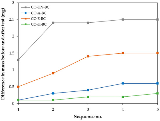 For an all-cellulose biocomposite to be functional, it must have strong adhesion between the matrix (BC membrane) and the reinforcing phase (cotton fabric), as well as improved elasticity under load. In reviewing the literature on testing the adhesion of thin coatings to various substrates, it was found that the most commonly used method is the tape method described in ASTM D3359, “Standard Test Methods for Rating Adhesion by Tape Test”. In this method, a piece of adhesive tape is applied to the surface of a damaged sample and then quickly peeled off to visually rate the adhesion on a scale of zero to five [45,46,47,48,49]. As this method provides qualitative rather than quantitative results, some researchers have adapted the test to obtain more specific adhesion ratings [11,50,51]. According to the ASTM D3359 method, the best adhesion (5A) was rated for the biocomposite sample in which cotton treated with H-mode oxygen plasma was used (sample CO-H-BC), followed by the biocomposite sample in which cotton treated with plasma afterglow was used (sample CO-A-BC, adhesion rating 4A) (Table 4). Low adhesion ratings (1A) were found for the samples in which untreated and E-mode plasma-treated cotton fabric were used. In addition, we performed a quantitative assessment. To quantify the adhesion within a biocomposite, the weight of the sample was measured both before and after up to five tape-test sequences (although the standard specifies only an assessment after a single sequence). The results of the quantitative adhesive tape test (Figure 5) clearly showed poor adhesion for the CO-UN-BC and CO-E-BC samples and good adhesion for the CO-A-BC and CO-H-BC samples. The difference in the mass of the BC membrane removed from the cotton fabric within the biocomposite was greatest for the sample where untreated cotton fabric was used, wherein most of the BC membrane covering the cotton fabric was removed after the tape was first pulled (Figure 5). For the CO-E-BC biocomposite, where a cotton fabric treated with plasma in E-mode was used as reinforcement, the removal of the BC membrane was greater after the second test sequence than after the first. Very gradual removal, with very little difference in mass before and after the tape test, was observed in the biocomposites with the best adhesion ratings (samples CO-A-BC and CO-H-BC).