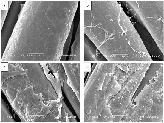 The SEM images in Figure 6 depict the surface morphology of cotton fibers after the adhesive tape test. In the untreated cotton sample (Figure 6a), the BC membrane was completely removed, revealing the smooth and typical morphology of bleached and mercerized cotton fibers. Similarly, the afterglow-treated sample showed the typical cotton fiber morphology, with some remnants of bacterial cellulose fibrils protruding from the fiber surface (Figure 6b). In the H-mode-treated sample, more remnants of the BC membrane were visible (Figure 6d). Here, the cotton fiber morphology was less distinct, as the remaining BC membrane covered the fibers. Several bacterial cellulose fibrils clearly protruded from the membrane, obscuring the characteristic morphology of the cotton fibers.