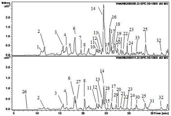 Illustration of the chromatograms (base peak chromatogram). The upper graph represents sample VA 4 and the lower WR 1. The following substances correspond to the peaks: 1—dihydroxybenzoic acid hexoside 2; 2—protocatechuic acid pentoside; 3—chlorogenic acid; 4—procyanidin B(2); 5—procyanidin B(3); 6—epicatechin; 7—p-coumaric acid glycoside; 8—p-coumaroyl quinic acid 2; 10—quercetin glucorhamnoside; 11—quercetin pentoside 1; 12—ellagic acid; 13—hyperoside; 14—quercetin 4’-glucuronide; 15—quercetin 7-glucuronide; 16—kaempferol glucoside; 17—isorhamnetin glucoside; 18—quercetin-3-(6”-(3-hydroxy-3-methylglutaryl)hexoside); 19—kaempferol glucuronide; 20—isorhamnetin/rhamnetin; 21—unknown 6; 22—acetylxyloside of ellagic acid; 23—isorhamnetin rhamnoside; 24—isorhamnetin rhamnoside 2; 25—unknown 10; 26—dihydroxybenzoic acid glucoside 1; 27—p-coumaroyl quinic acid 1; 28—isoquercetin; 29—isorhamnetin rhamnoside 1; 30—chlorogenic acid rhamnoside; 31—neochlorogenic acid rhamnoside; 32—isorhamnetin C-hexoside 2.