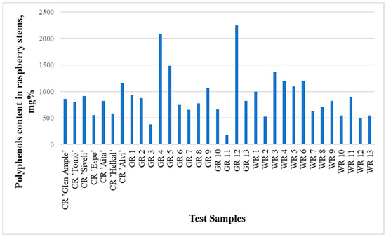 The largest amount of polyphenolic compounds was found in the garden raspberry sample GR12 (‘Polka’)—2246.2 mg%—and in the sample GR4—2089.6 mg%.