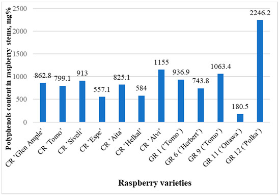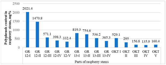 Polyphenolics in the stems of raspberry cultivars, mg% (mg in 100 g).