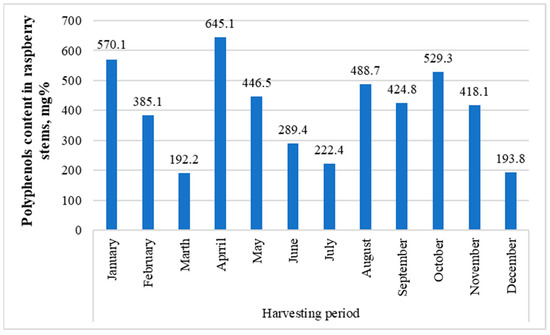 The variety of raspberry and its place of growth significantly impact the composition of substances contained in stems. Over the year, the largest amounts of them accumulated in the raspberry stems in January (570.1 mg%), April (645.1 mg%), and October (529.3 mg%). Therefore, these months are the most optimal for procuring raw materials.
