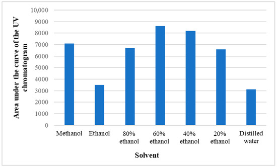 Preliminary tests were conducted with different ethanol concentrations (20–80%), methanol, and distilled water to find the most suitable solvent for extraction of the phenolic compounds under investigation. In doing so, the base area of the HPLC UV chromatogram was estimated at 280 nm, where most of the phenolic substances absorb radiation, and it was concluded, based on both the qualitative and quantitative contents of the substances, that it is optimal to use 60% ethanol for the study of polyphenols (Figure 7).