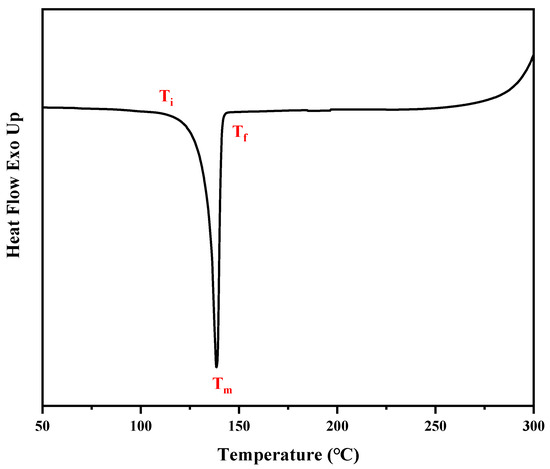 Figure 4 shows the DSC curve of EEPN, from which it can be seen that the starting melting temperature of EEPN is 125 °C, the melting point is 137 °C, and the termination melting temperature is 142 °C. The enthalpy of melting, ΔHf, can be calculated to be 28.7 J/g.