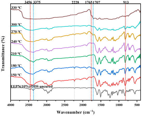 FTIR spectra of stepwise curing of EEPN (10%)/DDS. (FTIR samples were obtained from the cure process of EEPN/DDS at 150 °C for 2 h, 180 °C for 2 h, 210 °C for 2 h, 240 °C for 2 h, 270 °C for 2 h, 300 °C for 2 h, and 330 °C for 2 h, and each specific temperature is listed above the curve of the FTIR spectrum).