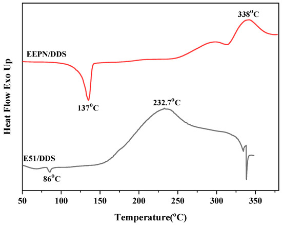 Figure 7 shows the DSC curves for E51/DDS and EEPN/DDS. As seen in the above graph, the DSC curves of both epoxy resins had a clear exothermic transition, and this exothermic phenomenon was caused by the reaction between the epoxy resin and the curing agent DDS. The onset curing temperature of the E51/DDS was 129.9 °C, the curing exothermic peak temperature of the E51/DDS resin was 232.7 °C, and the processing temperature window (the difference between the onset curing temperature and the exothermic peak temperature) was 102.8 °C. The DSC curve of the EEPN/DDS resin had a clear exothermic transition and a melting peak, and the test showed that the melting point of EEPN was 137 °C, which was close to the melting point of the EEPN monomer as measured by the DSC in the previous section; the cured exothermic peak temperature of this resin was 338 °C, and the processing temperature window was 201 °C.