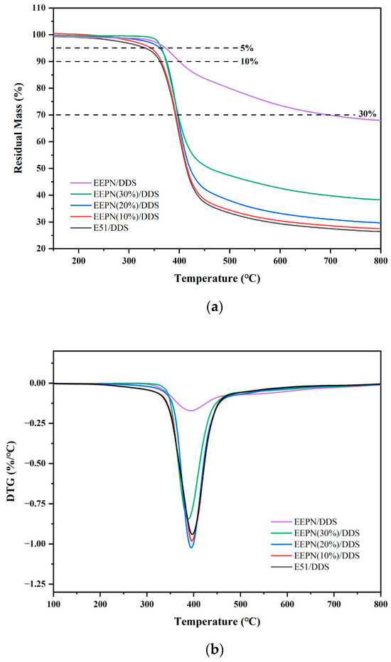 Figure 9 shows the TGA and DTG curves of cured resins for E51/DDS and EEPN(n)/DDS blend resins (n = 10%, 20%, 30%) heated from room temperature to 800 °C in a nitrogen atmosphere.