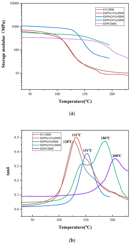 Figure 10 shows the DMTA test curves for cured E51/DDS and EEPN(n)/DDS. The storage modulus–temperature curves are shown in Figure 10a, and the loss factor–temperature curves are shown in Figure 10b.