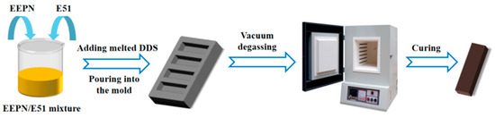 Bio-based epoxy resin EEPN was added to petroleum-based epoxy resin E51 in different proportions of the total mass of the resin to obtain different proportions of EEPN(n)/E51 hybrid resins. EEPN is a yellowish powdery substance at room temperature, and E51 is a colorless transparent viscous substance at room temperature. EEPN and E51 epoxy resins were accurately weighed in a beaker according to the mass ratios of 100:0, 30:70, 20:80, 10:90, and 0:100, and the specimens were labeled as EEPN, EEPN (30%)/E51, EEPN (20%)/E51, EEPN (10%)/E51, and E51 blends, respectively. The formulations of the blended resin and curing agent 4,4′-diaminodiphenyl sulfone (DDS) are shown in Table 4. The EEPN/E51/DDS mixture was dissolved in an appropriate amount of methylene chloride at room temperature and ultrasonically mixed well in a CNC ultrasonic cleaner, and then the solvent was removed by heating.