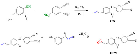In summary, based on the bio-renewable properties of eugenol and the excellent thermo-oxidative stability of PN resins, in this paper, eugenol-based phthalonitrile monomer (EPN) was first prepared from eugenol, o-phenyl 4-nitrophthalonitrile, and potassium carbonate, and then EPN was reacted with 3-chloroperoxybenzoic acid to generate a eugenol-based epoxy-phthalonitrile monomer (EEPN), as shown in Scheme 1. The EEPN was blended with epoxy resin E51. The curing process, curing mechanism, and curing kinetics of EEPN were investigated, and the thermal stability and the dynamic mechanical properties of EEPN and the blended resin were studied.