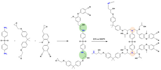 From the analysis based on FTIR spectroscopy as above, it can be surmised that the curing mechanism of the amine curing agent DDS curing EEPN/E51 blend resins is shown in Scheme 2. The main reaction types are the ring-opening reaction between the active hydrogen of the amine group in the amine curing agent and the epoxy group and the nucleophilic addition reaction between the active hydrogen of the amine group and the cyano group. Both the ring opening and nucleophilic addition reactions increased the cross-linking density of the polymer and produced a stable ring structure, which improved the thermal stability of the substance.
