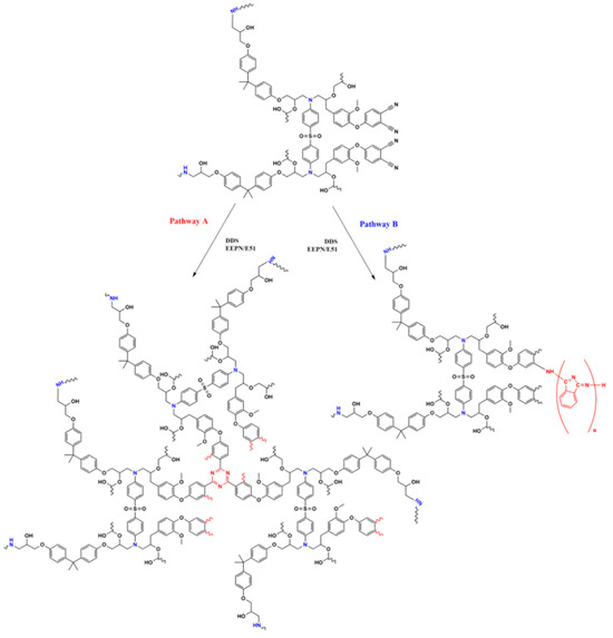Proposed curing mechanism of EEPN/DDS. (The blue part of the formula indicates the amine group, the green and pink circles mark the binding sites of E51 and EEPN epoxy groups with DDS curing, the red ‘Pathway A’ indicates the route of cyano-curing to form a triazine ring while the blue ‘Pathway B’ indicates the cyano-curing to form an isoindoline structure).