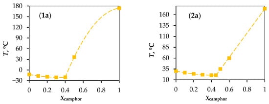 The formation of HESs was confirmed using Fourier infrared spectroscopy and 1H NMR spectroscopy. For this purpose, the spectra of the initial compounds and HESs based on them were recorded. The shift in the peak of the stretching vibration of the -OH group of alcohol (1-octanol and 1-dodecanol) and the shift in the peaks of vibrations of the functional groups of the second component in the HESs are shown in the obtained IR spectra (Figures S1–S10). The characteristic shifts are indicated in the figures. The obtained results indicate the formation of hydrogen bonds between the components in the HESs [32,33]. Phase diagrams of the mixtures were also constructed (Figure 1), except for the HESs based on 1-octanoic acid, for which phase diagrams were provided in a previous study [33]. The data confirm that the proposed solvents exhibit a eutectic phase diagram. It should also be mentioned that these HESs have a fairly wide range of liquid state, which allows varying the required amount of aliphatic alcohol.