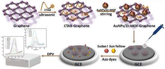 - Sun, R.; Lv, R.; Li, Y.; Du, T.; Chen, L.; Zhang, Y.; Zhang, X.; Zhang, L.; Ma, H.; Sun, H.; et al. Simple and Sensitive Electrochemical Detection of Sunset Yellow and Sudan I in Food Based on AuNPs/Zr-MOF-Graphene. Food Control 2023, 145, 109491. [Google Scholar] [CrossRef]