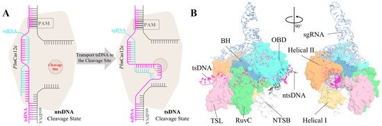 Previous studies have provided extensive static structural information on each stage of the cleavage process and the biochemical properties of various domains within PlmCas12e [8,17,18,19,21]. This enzyme can be divided into seven distinct domains, with TSL and RuvC identified as particularly crucial for the transition from the ntsDNA-cleaved to the tsDNA-loaded state. The NTSB domain is essential for initiating the sgRNA-tsDNA double helix; even the structure of the sgRNA has been confirmed to play a significant role in cleavage efficiency.